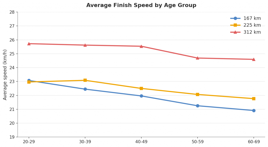 Na 225 km vidljiva je zanimljiva “kompresija” u rasponu 20-39 godina: prosječne brzine muškaraca gotovo su identične (23,16 naspram 23,25 km/h). Blagi “preokret”, gdje su tridesetogodišnjaci minimalno brži od dvadesetogodišnjaka, unutar je normalnih varijacija s obzirom na veličinu uzorka i potvrđuje da su te dvije skupine praktično u istom rangu po performansama.