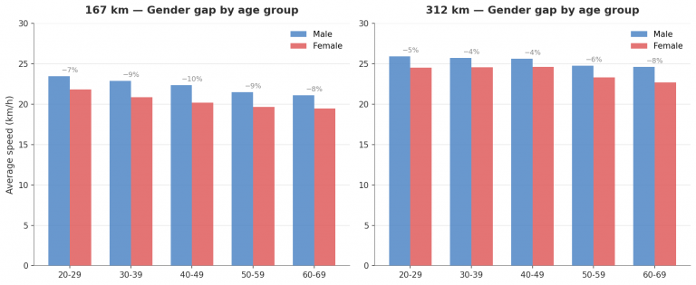 Razlika među spolovima iznenađujuće je stabilna kroz dobne skupine i kreće se između 7 % i 10 %. To je u skladu s tipičnim rasponom od 8-12 % koji se bilježi u treniranim populacijama sportova izdržljivosti poput maratona i dugog triatlona. Fiziološki gledano, razlika u aerobnom kapacitetu između treniranih muškaraca i žena relativno je konstantna i ne širi se niti sužava značajno s dobi među ozbiljnim natjecateljima. Razlika se ne povećava (što bi se očekivalo kad bi žene brže gubile performanse), ali se ni jasno ne smanjuje (što bi selekcijski efekti mogli sugerirati); u suštini razlika je ravna od dvadesetih do šezdesetih godina.