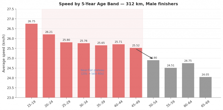 Podaci s 312 km najjače potkrepljuju potrebu preispitivanja desetogodišnjih skupina. Muške skupine 20-29, 30-39 i 40-49 razlikuju se za samo 0,20 i 0,09 km/h. Cijeli raspon od 20 do 49 godina pokriva tek 0,29 km/h razlike. A zatim dolaze pedesete i donose pad od 0,86 km/h u jednom koraku. Pad ulaskom u pedesete gotovo je deset puta veći od pada ulaskom u četrdesete. Upravo taj omjer, a ne samo smjer promjene, čini granicu na 50 godina jasno drugačijom od ostalih.