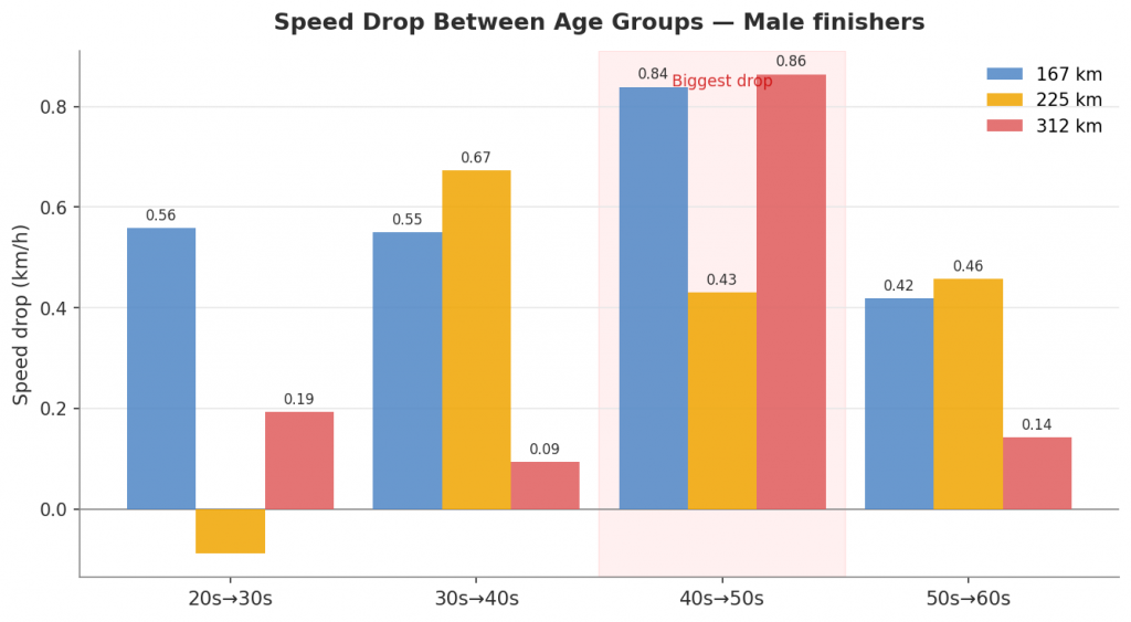 Na 167 km vidi se najravnomjerniji, gotovo linearan pad performansi. Svako desetljeće donosi pad od otprilike 0,5-0,8 km/h kod muškaraca. Uz gotovo 1.000 sudionika u skupinama 40-49 i 50-59, prosjeci su statistički vrlo stabilni.